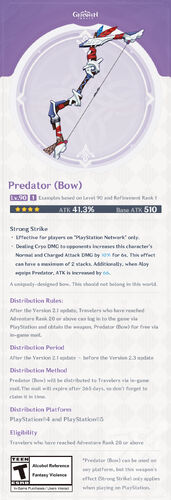 29 rows Bows are one of the five weapon types that characters can use in Genshin. Predator is a bow only obtainable on PlayStation to those who log into Genshin Impact during Version 21 or 22. It is designed to enhance.